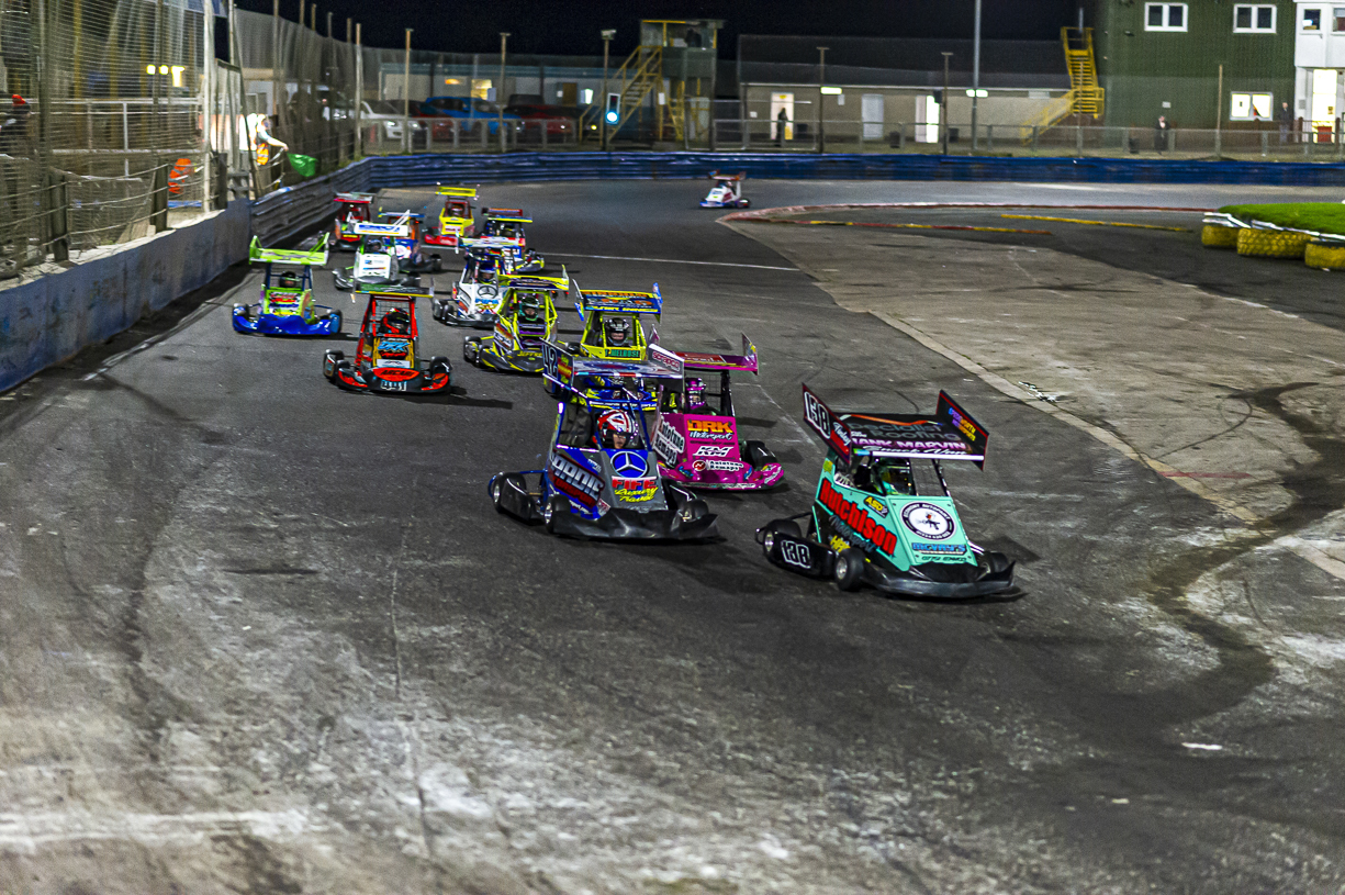 The Ninja Karts started off the evening with their whites and yellows race, which was won by Harley Wilson, before two reverse grid heats were formed as the drivers looked to qualify as high up the grid for the main race as possible. Race wins went the way of Rory Wilson and Henry Hunn, with the pair tossing a coin to determine who got pole position for the Scottish Championship race. Hunn won the toss, and with a rolling start for the Scottish Championship race, it was Alfie Shevill who got the best of the starts and moved into a early lead, though this didn’t last long as he ran wide into turn 1, which allowed Rory Wilson through into the lead. Further back, Hunn, Shevill, Blair Innes and the likes all battled closely for the places behind. A race caution later in the race bunched the pack up for what was a dash to the line for the closing laps. Wilson held on to take the win, with Hunn finishing just ahead of Innes.