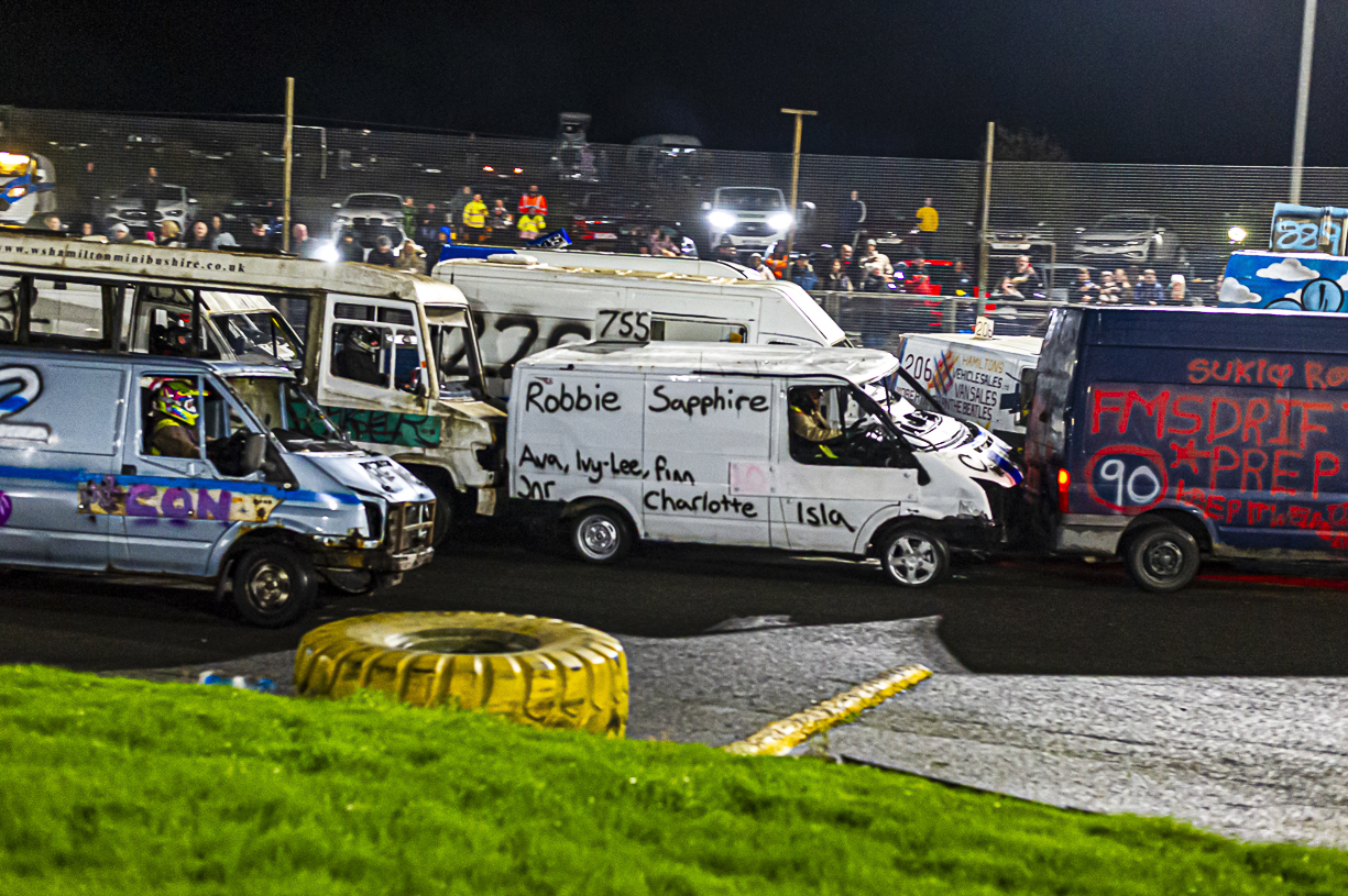 The Big Van Bangers headlined the bill with around 25 vans taking to the track as they battled it out for the Forth Bakers Scottish Championship. It was carnage from the outside as the vans piled into corner on the opening lap with vans spinning, hitting the wall and collecting each other. Fraser Hamilton was showing good pace up front, whilst Douglas McConnachie and Neil Sutherland also looked quick, with Sutherland getting stuck in on a few occasions throughout the race. Sean McConnachie and Stephen van Putten entertained throughout the night in their buses. Barry Innes took a full on blow as he was stricken across the track from McConnachie. The first all comers race was full of action as the vans delivered superb entertainment – with just McConnachie managing to cross the line with no other finishers!! The evening was completed with a Demolition Derby, with around 10 vans participating in that event. The track was left with bits of van scattered all around – with McConnachie, Sutherland, Barron and van Putten all delivering some big hits.