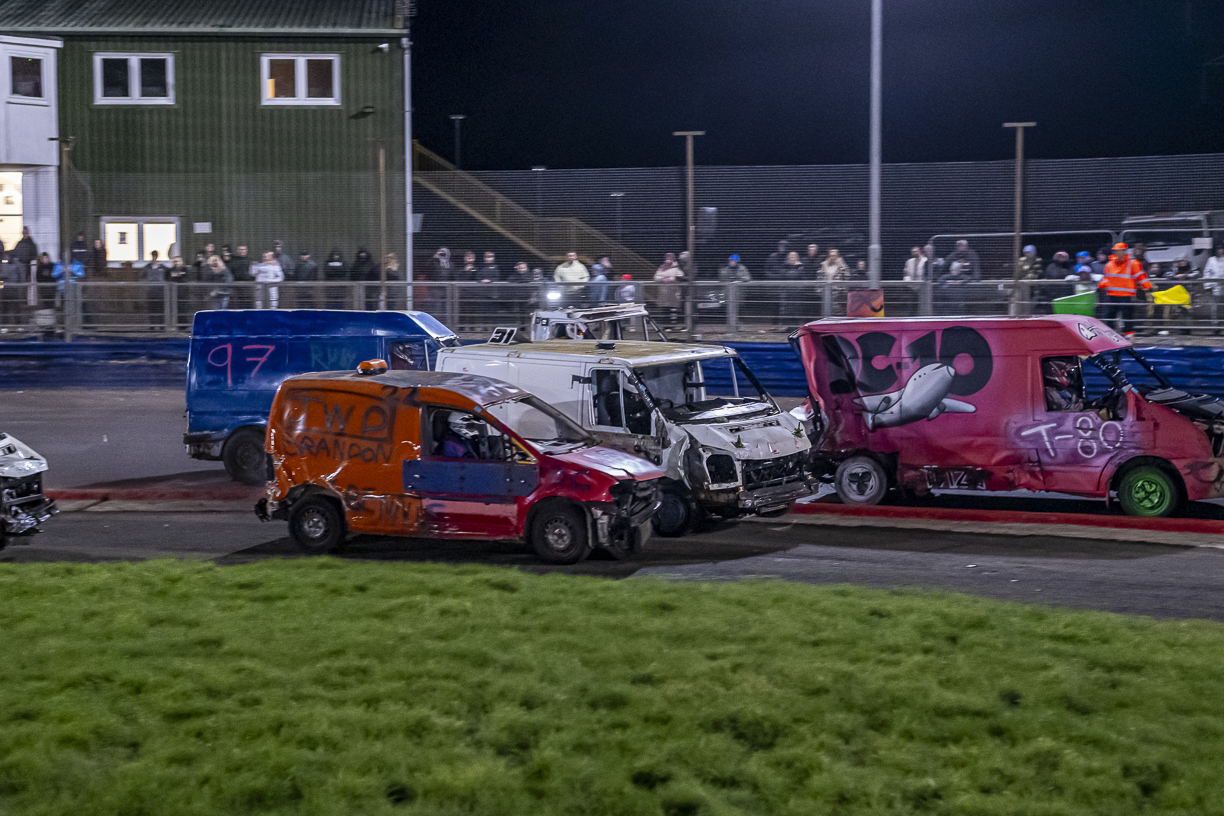 The Van Bangers raced in round 1 of the Dhoom Indian Streatery Cash Chasher Series, which doubled up as the Shaun Walsh Memorial event, and we seen 25+ vans take to the track on the night. With this amount, it was certain to be action packed! The plate took a battering, the traffic lights even took a hit, and the crowd was delighted with what they seen from the vans. The drivers got stuck in, very few overtook anyone without hitting them, and only 5 vans finished the opening race, with Kai McNulty coming out on top in the Shaun Walsh Memorial. Barry Jarman brought out what appeared to be an old fish van, and it soon found itself scattered across the track! Connor Jones looked to be in the mix as well, though, he found himself caught up with only a few laps remaining and lost ground in the process, eventually finishing in fourth position. The first ‘heat’ of the night in the vans was another entertaining event, with Ryan Martin coming away victorious – though, that was in doubt too and he only held on thanks to a large lead that he had built up prior to getting caught up in a pile up midway through the race. McNulty finished in second, whilst old timer William Stawiarski secured a third place finish. The final race of the night for the vans would turn into a demolition derby, and it was the impressive looking van of Iain Tait that took the win in the race, before Ryan Martin took the win in the DD.