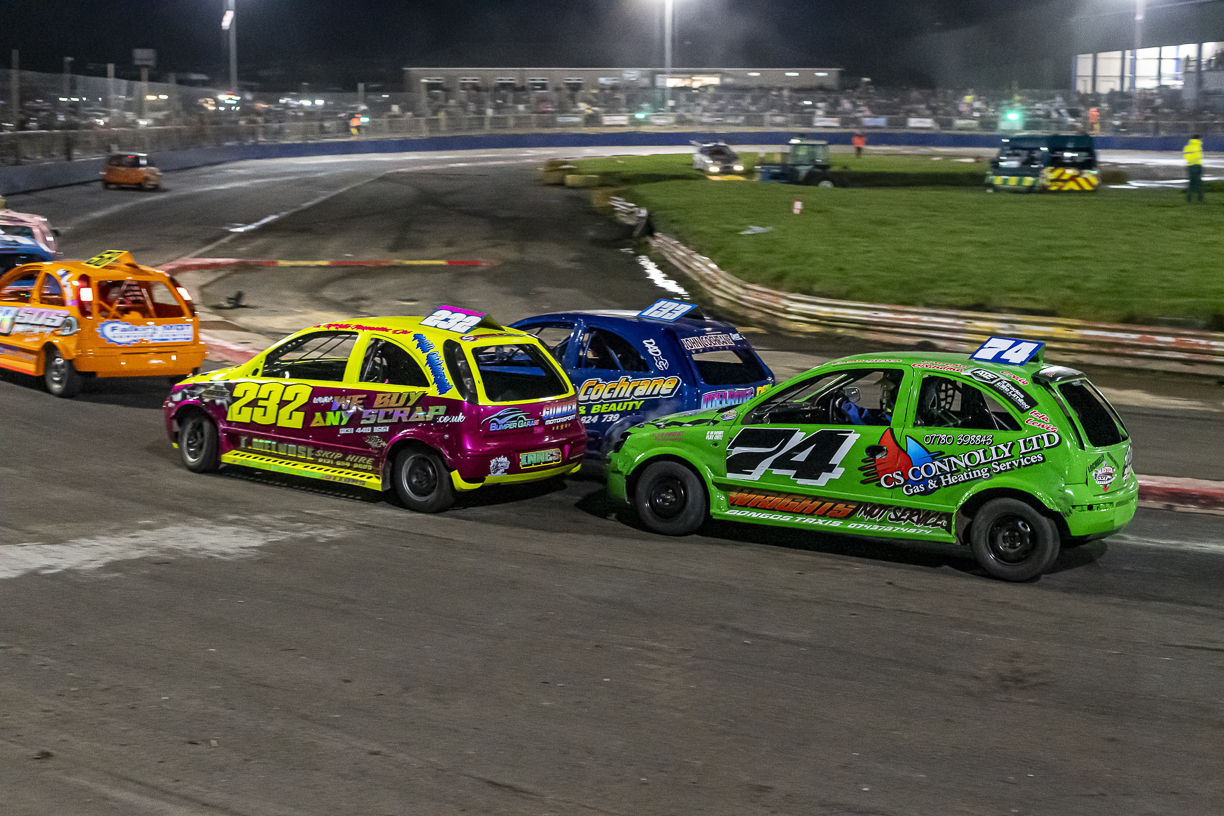 The Superstox formula raced for the Mick Taylor Lochgelly Masters. There was also a dash for cash at the end of the meeting for the formula, sponsored by Great Dane Welfare Scotland. The Superstox were in great form, with hard hitting action throughout each of the three races – Curtis Tebbenham found his feet and drove well in the formula. Adam Low took the win in the opening heat and wasn’t far away from making it a double, as Aaron Riddell pipped him in the closing stages of heat 2. Bryan Forrest took the win in the Lochgelly Masters race, finishing ahead of Aaron Riddell and Adam Low. The Dash race seen the bumpers go in from the outset, with a few cars spinning in the opening laps. Curtis Tebbenham led the way for the majority of the race, before Riddell moved through and into the lead, followed by Callum Kelman.